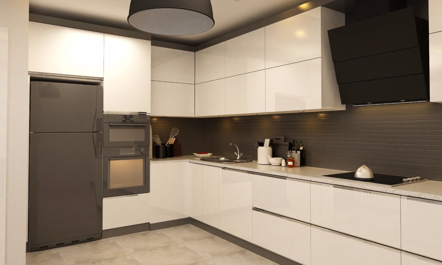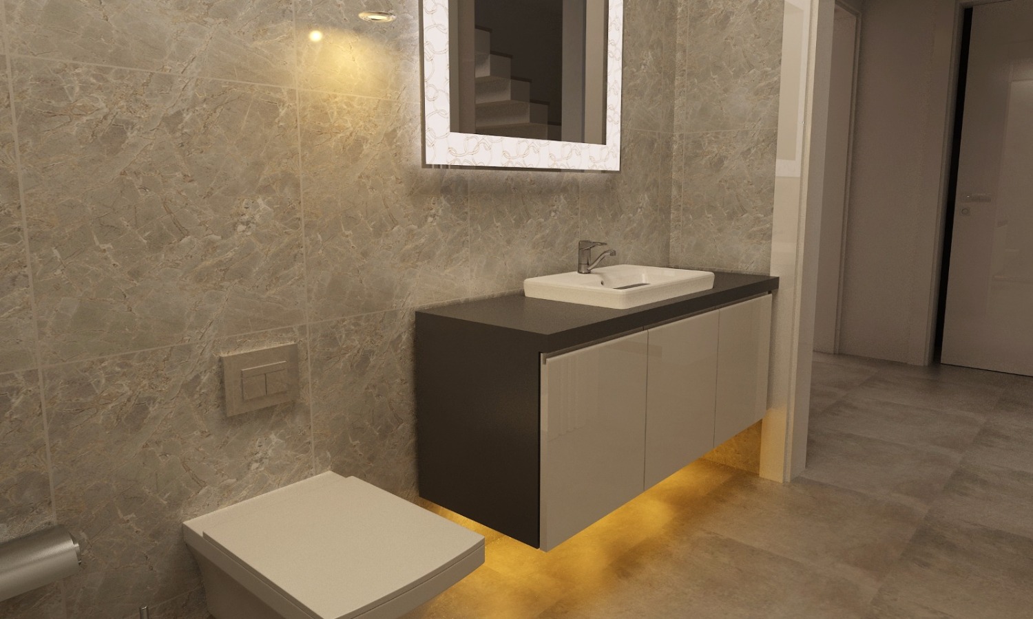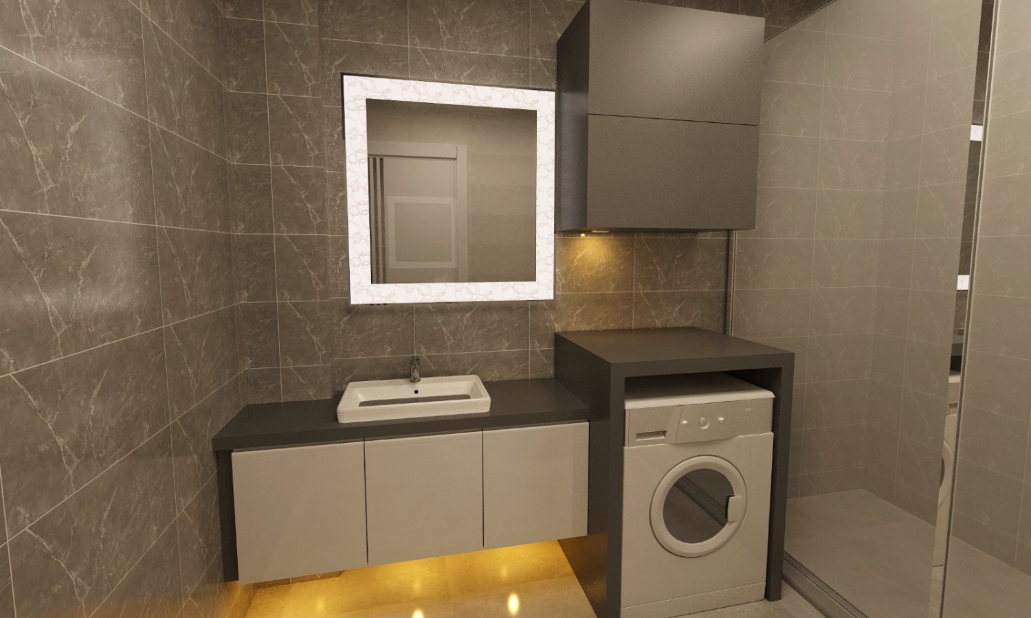 Banyo tasarımında son trendlerin takip ediliğini söylemek mümkün. Minimal bir tarz tercih edilmiş ve koyu renk duvarlar gri zemin ve beyaz tavanla uyumlu bir şekilde kullanılmış. Banyoya ayrılan alanın da ortalama ölçülerin bir hayli üstünde olduğunu söylemekte yarar var.