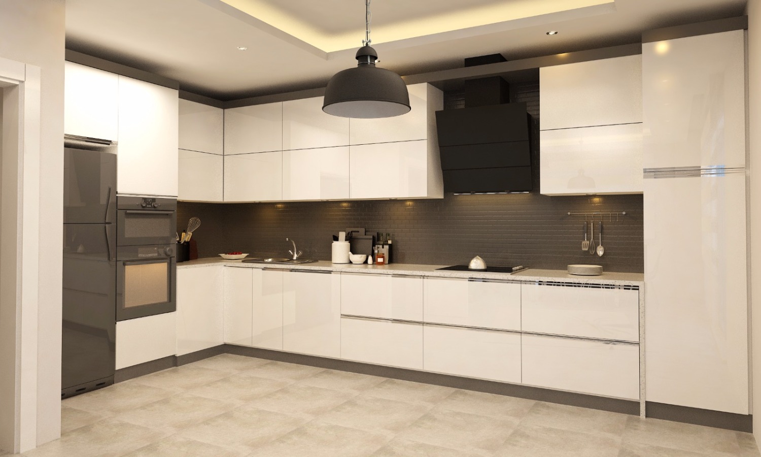Muhteşem bir açık mutfakTam merkezinde geniş bir yemek masasının da bulunduğu son derece geniş açık mutfak, geniş cam kapılar sayesinde doğrudan bahçeye açılıyor. Yaz aylarında kapılar açıldığında bahçeyle kesintisiz bir şekilde birleşebilecek konumda olan bu mutfak, ister içeride, ister dışarıda, ister yazın, ister kışın misafirlerinizi ağırlamak için dört dörtlük bir ortam sunuyor.